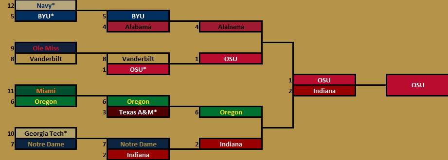 - OSU, Indiana, Texas A&M, Alabama, Georgia Tech, BYU, and Navy make it to their respective conference championships undefeated in conference play